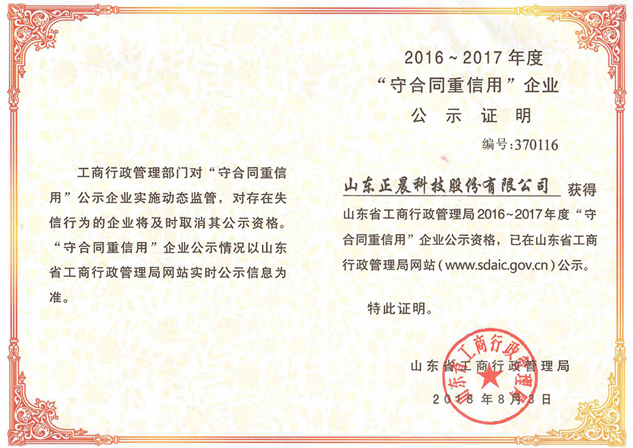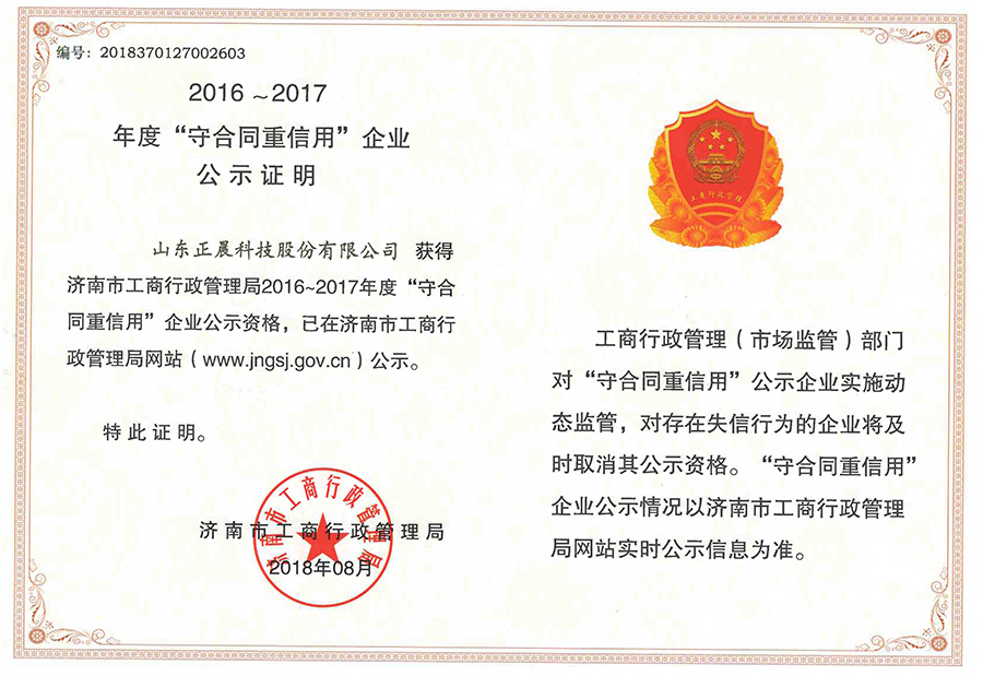 近日,山东荣耀体育官方科技股份有限公司荣获2016-2017年度山东省工商行政管理局“守合同重信用”荣誉称号和济南市工商行政管理局“守合同重信用”荣誉称号,这也是荣耀体育官方股份自2009年起连续十年获此殊荣。